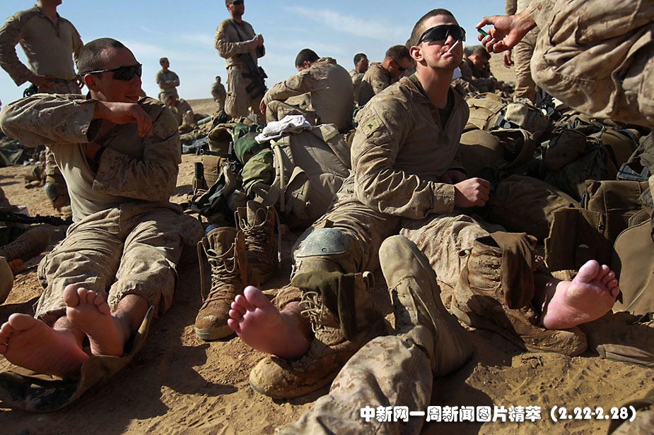 23日(周二),在阿富汗馬爾賈城,美軍陸戰(zhàn)隊(duì)士兵們在行動(dòng)結(jié)束后坐下來休息。