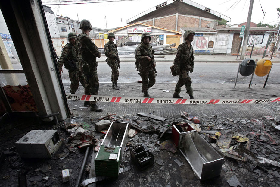 智利總統(tǒng)巴切萊特當(dāng)日說(shuō),政府派往災(zāi)區(qū)維持治安的軍人數(shù)量已達(dá)14000人,地震重災(zāi)區(qū)的搶劫現(xiàn)象已得到控制。圖片來(lái)源:中國(guó)新聞網(wǎng)