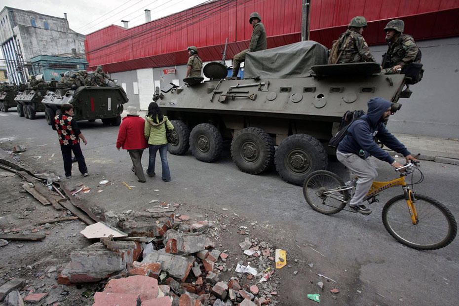 3月2日,智利軍警在街頭維持秩序。智利總統(tǒng)巴切萊特當(dāng)日說,政府派往災(zāi)區(qū)維持治安的軍人數(shù)量已達(dá)14000人,地震重災(zāi)區(qū)的搶劫現(xiàn)象已得到控制。圖片來源:中國新聞網(wǎng)