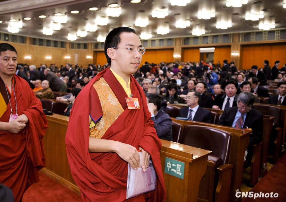 3月3日下午,全國(guó)政協(xié)十一屆三次會(huì)議在北京人民大會(huì)堂開幕,十一世班禪額爾德尼·確吉杰布出席會(huì)議。中新社發(fā) 廖攀 攝