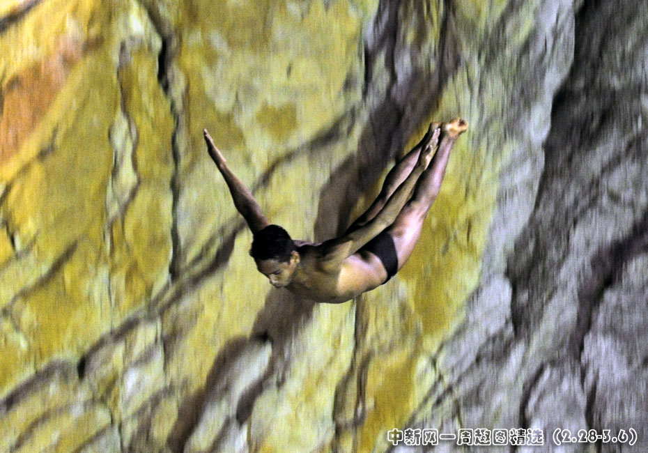 3月1日,墨西哥一名懸崖跳水愛好者手持火把,在該國(guó)南部城市阿卡普爾科的“拉·奎布拉達(dá)”懸崖上跳水。此種傳統(tǒng)可追溯至1934年。當(dāng)時(shí),住在阿卡普爾科市的兩位鄰居相互“挑戰(zhàn)”,通過(guò)從懸崖上跳向海中來(lái)比試各自的勇氣和力量。圖片來(lái)源:中國(guó)新聞網(wǎng)>>點(diǎn)擊觀看詳細(xì)內(nèi)容