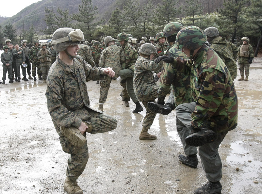 3月11日,在韓國鎮(zhèn)海海軍基地,韓美兩國的海軍陸戰(zhàn)隊(duì)舉行了聯(lián)合反恐軍事演習(xí)。