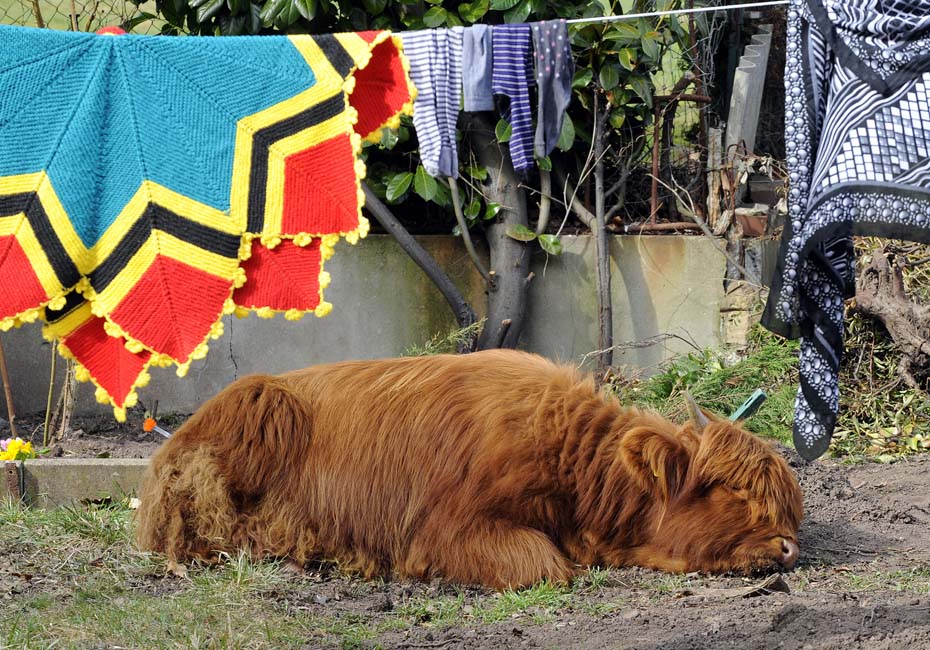 3月18日,德國一頭蘇格蘭高地牛來到一居民院內懶洋洋的曬太陽,最后經過獸醫(yī)的麻醉和消防員協力才將這頭蠻力十足的家伙“制服”。圖片來源:中國新聞網