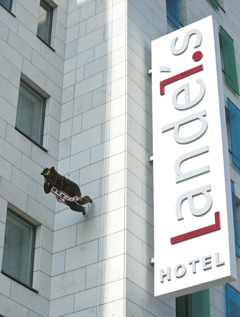 3月18日,在德國(guó)柏林舉行的“高樓漫步”活動(dòng)中,一名女子打扮成熊的模樣(柏林的象征)在天使酒店外墻上行走,參加活動(dòng)的人都有繩索保護(hù)。圖片來(lái)源:中國(guó)新聞網(wǎng)