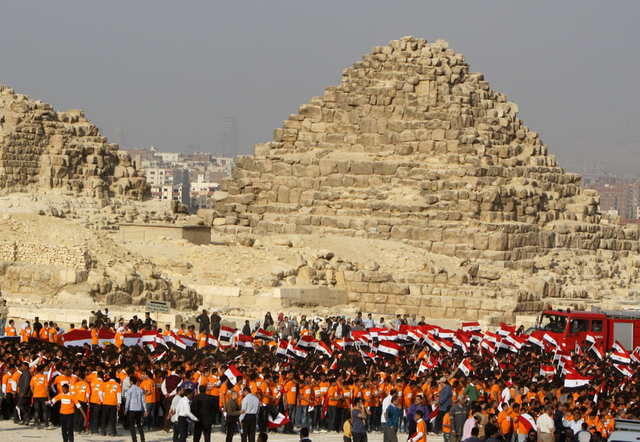 3月26日,4550名埃及兒童在首都開羅市郊的胡夫金字塔前揮舞埃及國旗,創(chuàng)造了在同一地點集體揮舞國旗的吉尼斯世界紀(jì)錄。