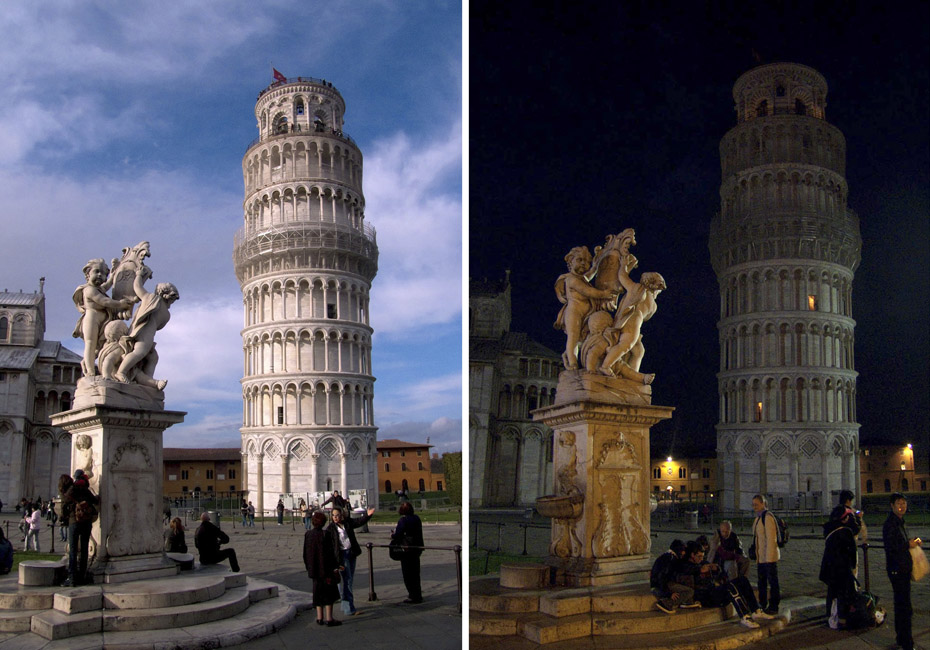 由世界自然基金會發(fā)起的“地球一小時”環(huán)保活動27日20點(diǎn)30分按照時區(qū)依次在全球數(shù)千個城市展開。圖為意大利比薩斜塔在熄燈前和熄燈后的景色。
