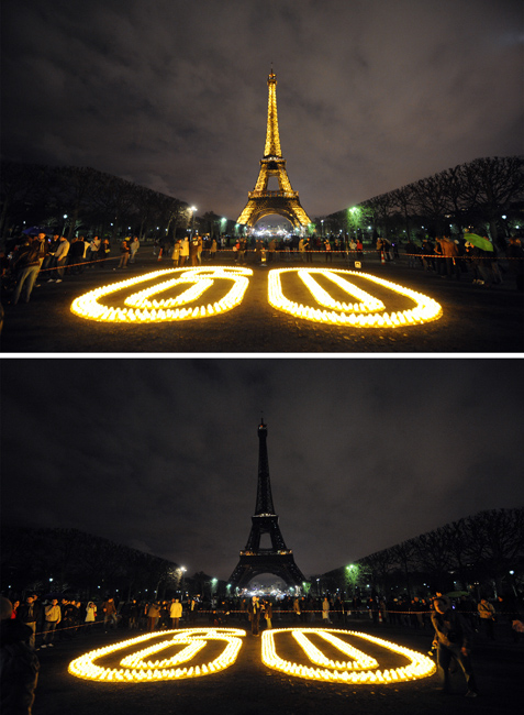 由世界自然基金會(huì)發(fā)起的“地球一小時(shí)”環(huán)保活動(dòng)27日20點(diǎn)30分按照時(shí)區(qū)依次在全球數(shù)千個(gè)城市展開(kāi)。圖為法國(guó)巴黎埃菲爾鐵塔熄燈后和亮燈后的照片。