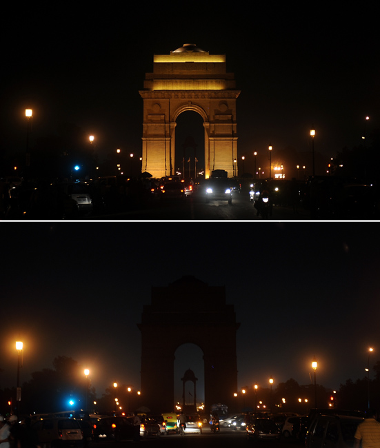 由世界自然基金會(huì)發(fā)起的“地球一小時(shí)”環(huán);顒(dòng)27日20點(diǎn)30分按照時(shí)區(qū)依次在全球數(shù)千個(gè)城市展開。圖為印度門在熄燈前和熄燈后的景色。