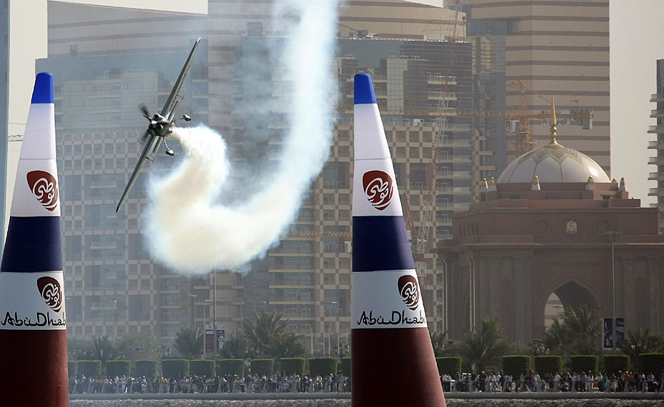 近日,紅牛飛行系列賽世界錦標(biāo)賽預(yù)選賽在阿拉伯聯(lián)合酋長國阿布扎比舉行。參加比賽飛行員不但要有高速的駕駛技術(shù),還要有勇往直前的膽量。圖片來源:中國新聞網(wǎng)