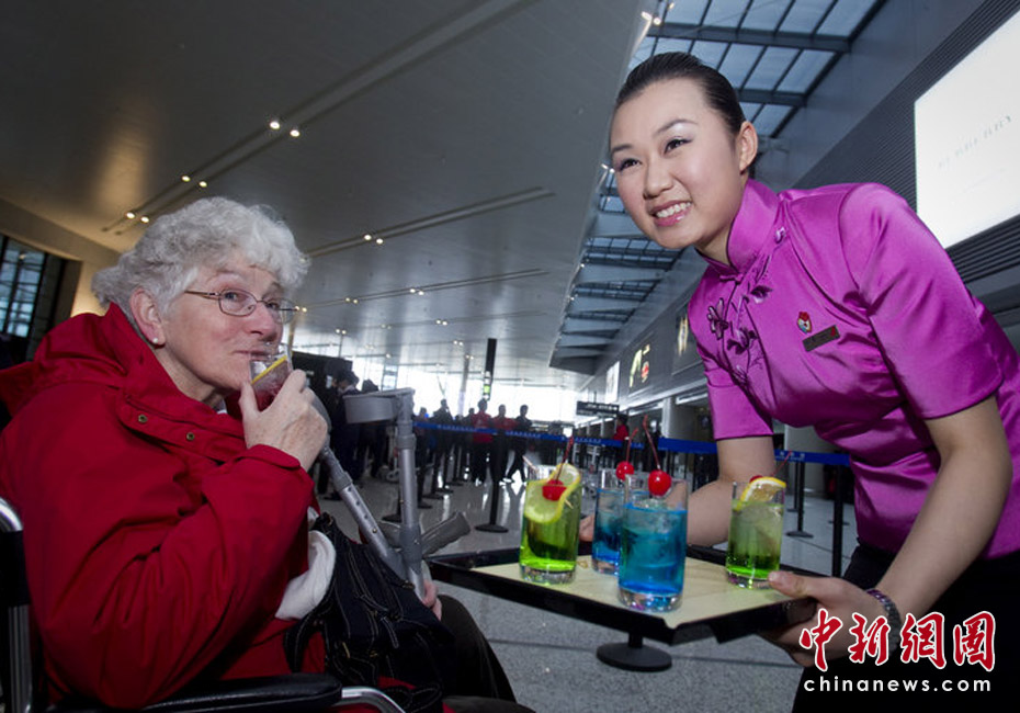 3月25日,上海虹橋機(jī)場T2航站樓。上航世博金牌示范乘務(wù)員徐翼邀請一名坐在輪椅上的外國旅客品嘗“世博特飲”。劉行喆/CFP