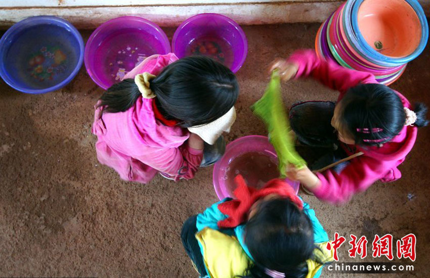 劉蕙玫和兩個同學(xué)一起共用一個盆水洗臉,而這“盆”水只是兩杯水。沙浪 攝