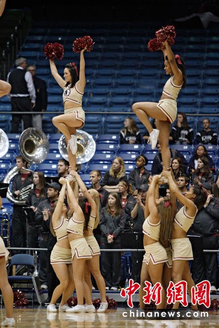 啦啦隊(duì)的歷史可追溯到原始部落時期,戰(zhàn)士們狩獵凱旋歸來時,人們給予歡呼及鼓勵的動作。最初的拉拉隊(duì)要追溯到19世紀(jì)80年代的美國大學(xué)校園,當(dāng)時的形式是在大學(xué)里的橄欖球賽上,一位領(lǐng)隊(duì)站在一大群人前面領(lǐng)導(dǎo)他們?yōu)樽约旱那蜿?duì)吶喊助威。圖片來源:中國新聞網(wǎng)