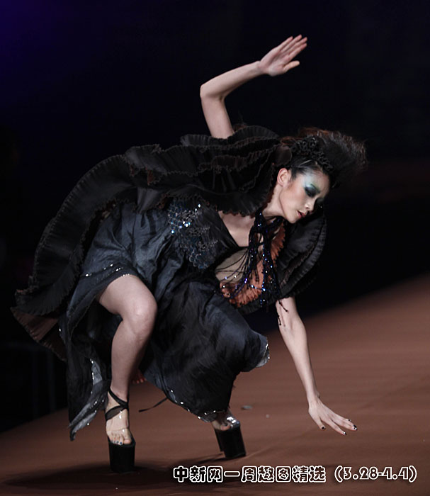 3月29日晚,旭化成·中國時裝設計師創(chuàng)意大獎張義超作品發(fā)布會在北京舉行,一名模特在T型臺上“失足”摔倒。圖片來源:中國新聞網>>點擊觀看詳細內容