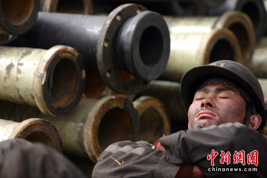 3月30日,“3·28”山西王家?guī)X煤礦透水事故搶險(xiǎn)工作仍在進(jìn)行。礦山救護(hù)隊(duì)與礦工們?yōu)榧涌炫潘M(jìn)度,夜以繼日地工作,不斷增添新的排水管道以便盡快救出井下被困礦工。圖為疲憊的救援人員正在小憩。中新社發(fā) 張?jiān)?攝