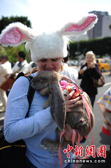 當(dāng)?shù)貢r(shí)間4月4日,美國(guó)洛杉磯人們?cè)跉g慶復(fù)活節(jié)的同時(shí),也為他們的寵物舉行了祝福儀式。這項(xiàng)祝福儀式每年舉行一次。圖片來(lái)源:中國(guó)新聞網(wǎng)