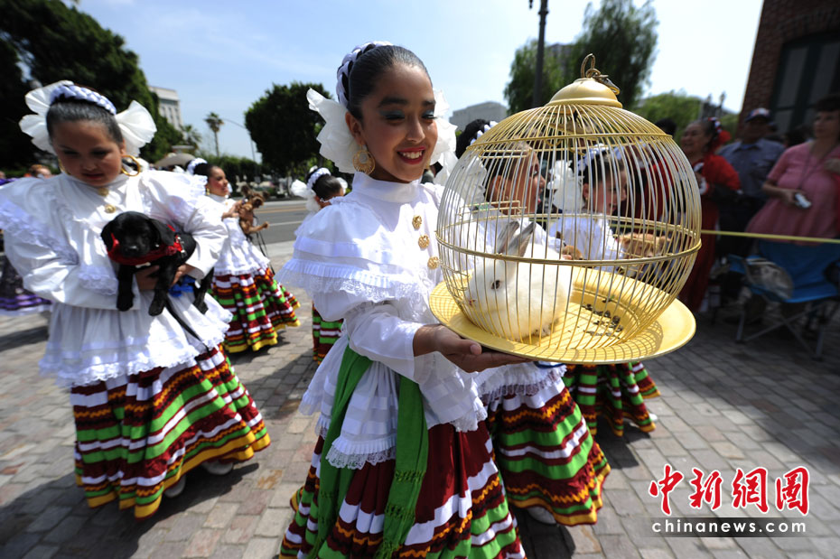 當?shù)貢r間4月4日,美國洛杉磯人們在歡慶復(fù)活節(jié)的同時,也為他們的寵物舉行了祝福儀式。這項祝福儀式每年舉行一次。圖片來源:中國新聞網(wǎng)