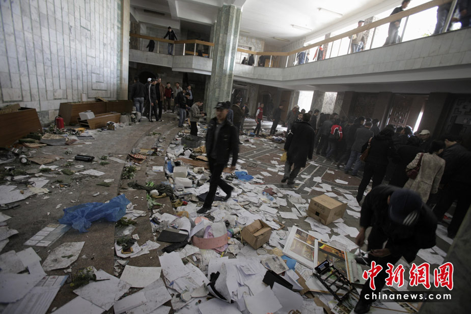 吉爾吉斯斯坦7日發(fā)生大規(guī)模騷亂,反對派示威者占領(lǐng)了議會大樓,8日,總統(tǒng)府也被示威者占領(lǐng)。圖為政府總部一片狼藉。