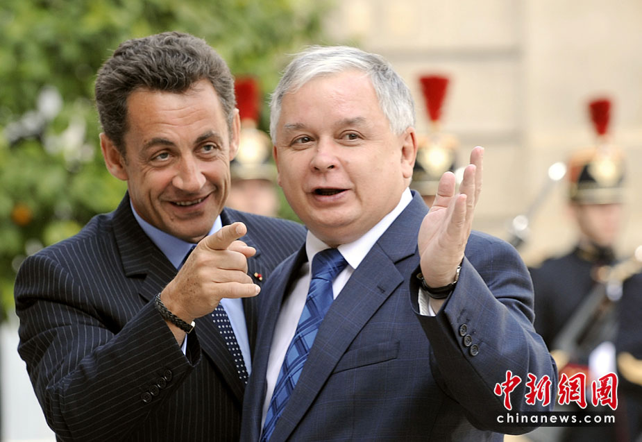 波蘭總統(tǒng)卡欽斯基乘坐的一架圖-154飛機(jī)10日在俄羅斯斯摩棱斯克州北部一軍用機(jī)場降落時(shí)失事,至少87人死亡?J斯基本人被確認(rèn)身亡。圖為2007年波蘭總統(tǒng)卡欽斯基與法國總統(tǒng)薩科奇。