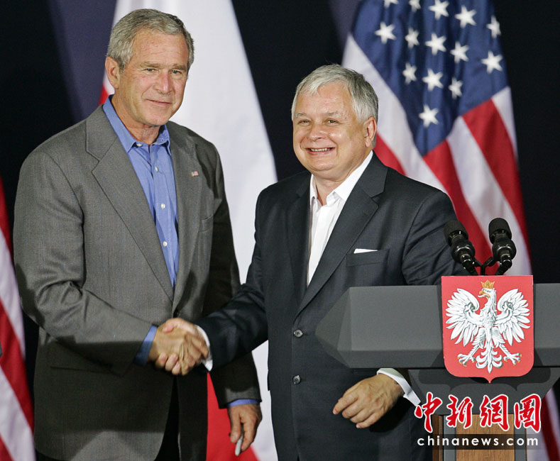 波蘭總統(tǒng)卡欽斯基乘坐的一架圖-154飛機10日在俄羅斯斯摩棱斯克州北部一軍用機場降落時失事,至少87人死亡。卡欽斯基本人被確認(rèn)身亡。圖為2007年波蘭總統(tǒng)卡欽斯基與美國前總統(tǒng)小布什。
