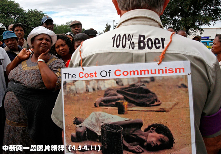 4月6日周二,在南非小鎮(zhèn)文特斯多,被害“白人至上”領(lǐng)導(dǎo)人尤金•特雷布蘭奇的一名支持者(圖右,背對(duì)鏡頭者)站在法院門外對(duì)人群講話。