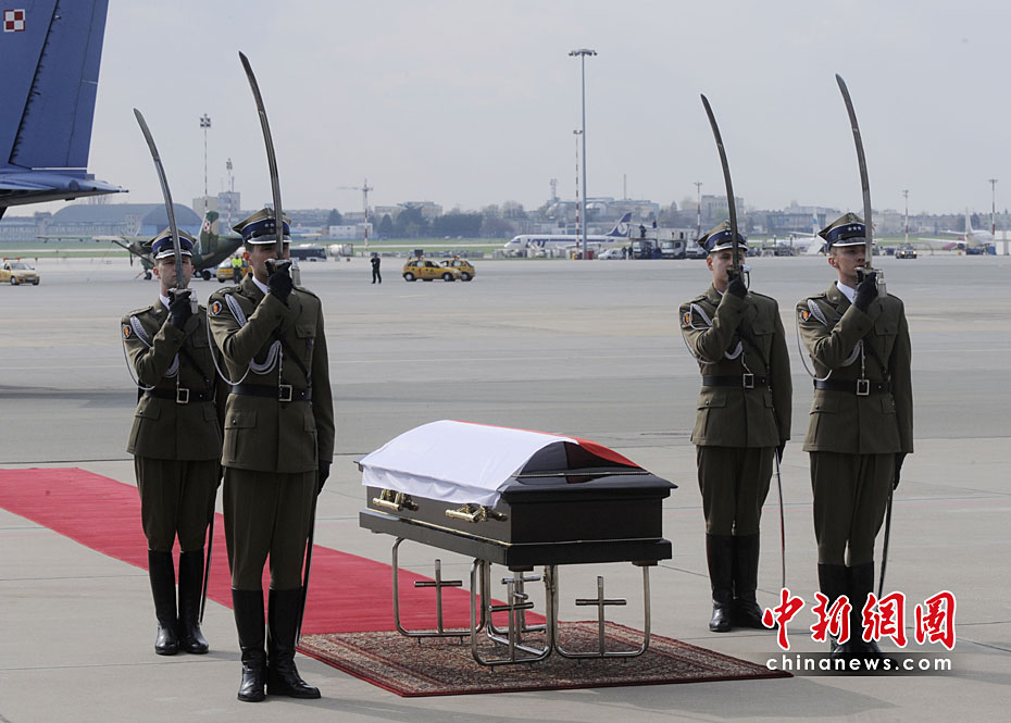 4月10日,卡欽斯基乘坐專機從華沙飛往俄羅斯斯摩棱斯克市,參加卡廷森林事件70周年紀念活動。途中飛機在斯摩棱斯克“北方”軍用機場附近降落時失事,共造成包括卡欽斯基夫婦及眾多政府高官在內(nèi)的96人死亡。慘劇發(fā)生后,舉世震驚。圖為卡欽斯基的遺體抵達華沙。