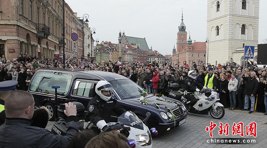 4月10日,卡欽斯基乘坐專機從華沙飛往俄羅斯斯摩棱斯克市,參加卡廷森林事件70周年紀念活動。途中飛機在斯摩棱斯克“北方”軍用機場附近降落時失事,共造成包括卡欽斯基夫婦及眾多政府高官在內(nèi)的96人死亡。慘劇發(fā)生后,舉世震驚。圖為華沙市民迎接卡欽斯基“回家”。