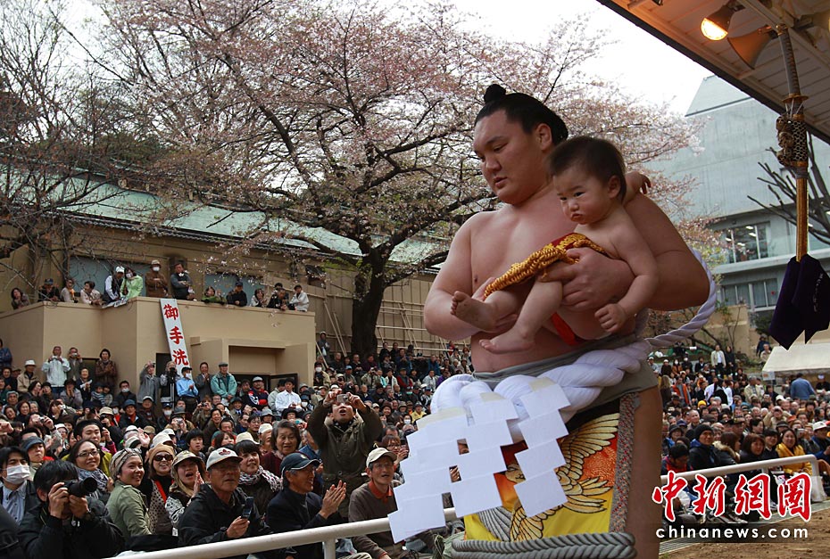 4月9日,來自世界各地的相撲選手齊聚日本東京靖國神社內的相撲館參加為期一天的日本供奉大相撲比賽。圖片來源:中國新聞網(wǎng)