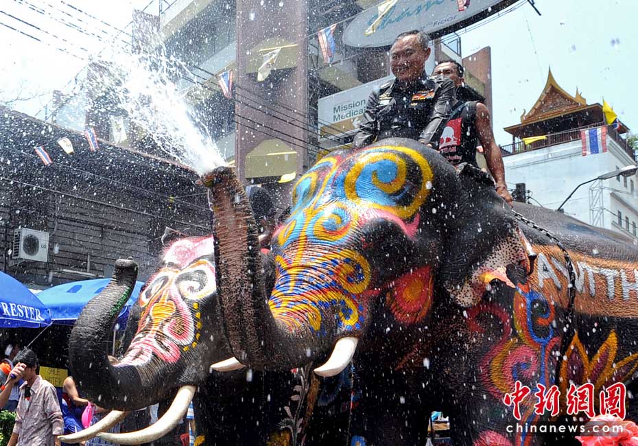 4月12日,泰國(guó)迎來(lái)一年一度的潑水節(jié),在拷桑路旅游區(qū)人們用水槍與大象“互噴”希望為對(duì)方送上祝福同時(shí)慶祝泰國(guó)新年。圖片來(lái)源:中國(guó)新聞網(wǎng)