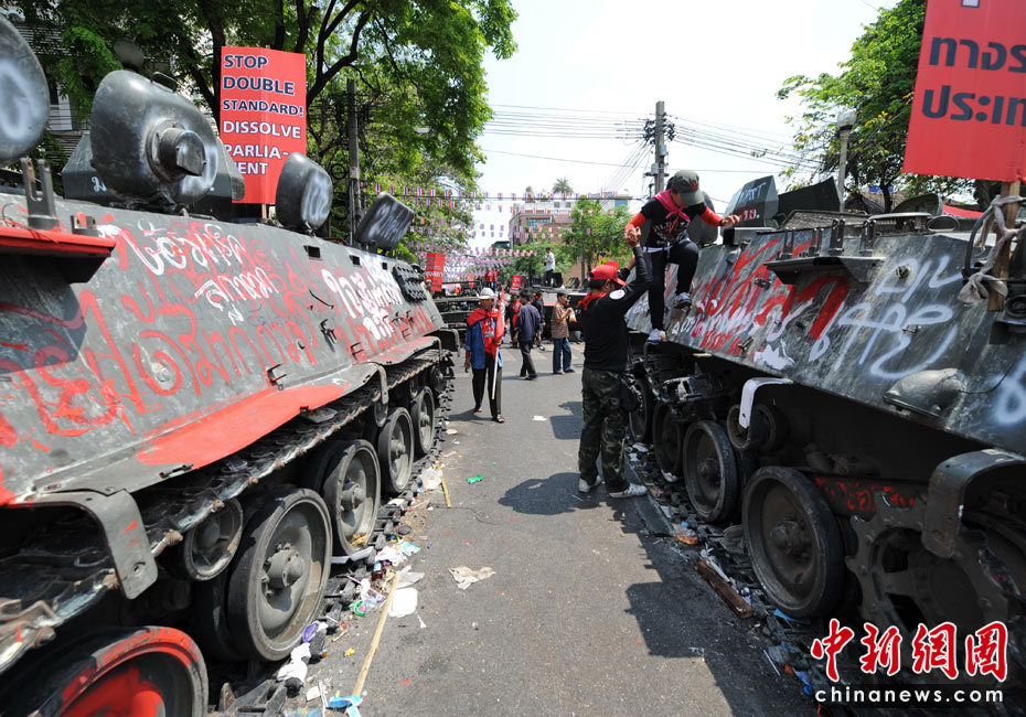 當(dāng)?shù)貢r(shí)間4月12日,泰國(guó)紅衫軍在曼谷市區(qū)抬著棺材舉行游行,借此向政府施壓促阿披實(shí)下臺(tái)。此前紅衫軍示威者與軍警發(fā)生沖突,造成21人死亡。圖片來(lái)源:中國(guó)新聞網(wǎng)