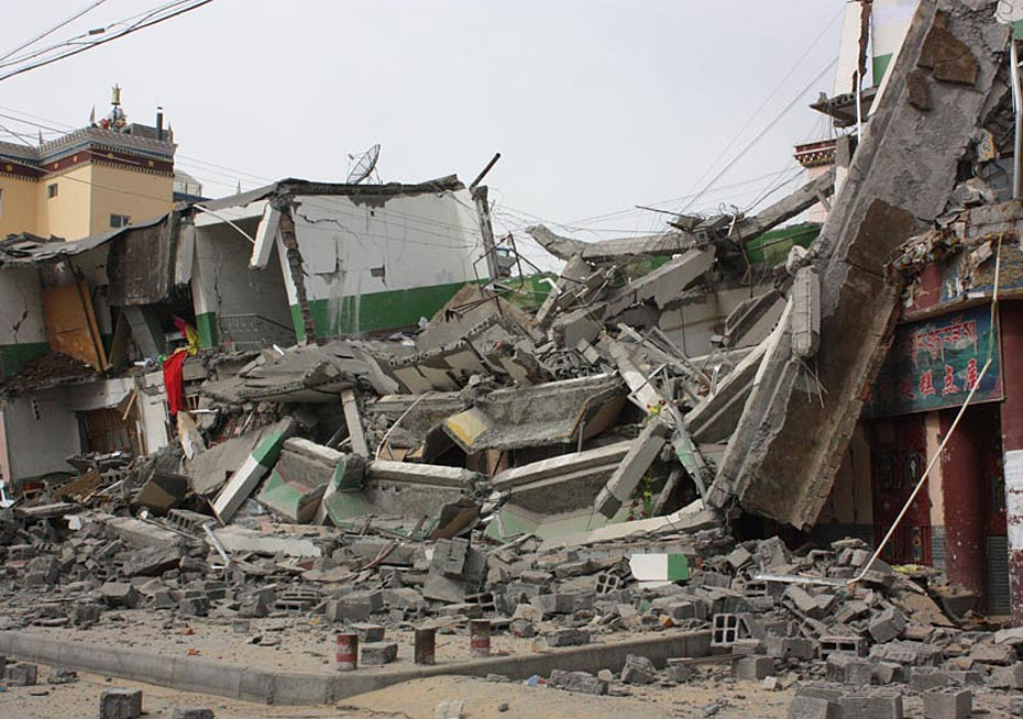 圖為4月14日拍攝的玉樹州結(jié)古鎮(zhèn)倒塌的房屋。圖片來源:新華網(wǎng) 吳宏 攝