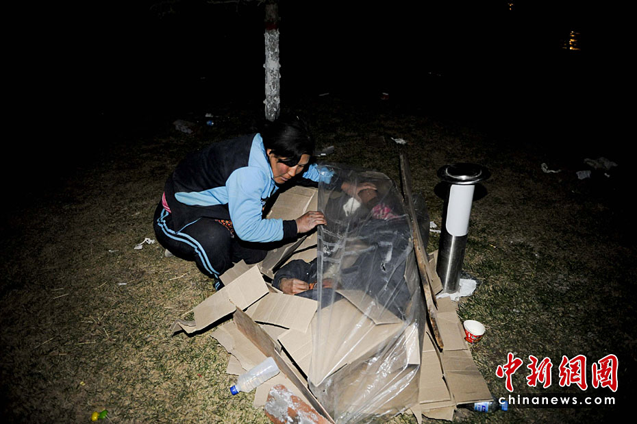 圖為4月15日凌晨,青海玉樹地震受災民眾在露天睡覺,由于救災物資匱乏有的民眾只得以塑料薄膜當棉被御寒。中新社發(fā) 廖攀 攝