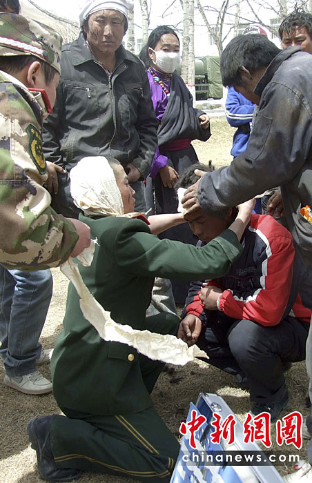 圖為4月14日15時,武警玉樹支隊駐地,一名在地震中受傷的武警戰(zhàn)士救治當?shù)厥軅癖。中新社發(fā) 李恩權 攝