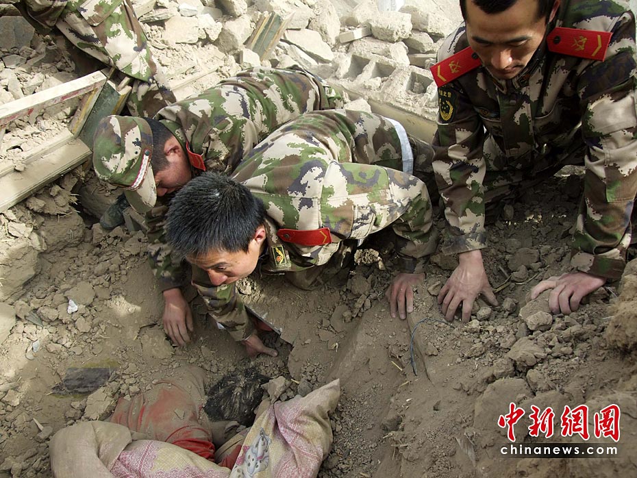 圖為4月14日11時(shí),武警玉樹(shù)支隊(duì)的戰(zhàn)士在玉樹(shù)縣結(jié)古鎮(zhèn)地震廢墟里救助被困民眾。中新社發(fā) 張守國(guó) 攝