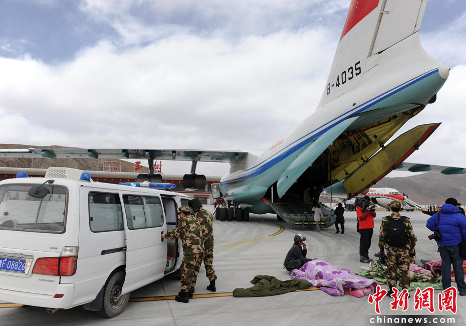 15日下午3時許,空軍動用一架伊爾-76運輸機在玉樹機場起運30多位震災(zāi)傷員,就近飛往成都市進行救治。中新社發(fā) 符永康 攝
