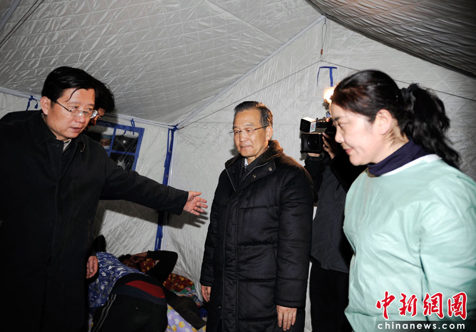 4月15日20時,中國國務(wù)院總理溫家寶來到青海省玉樹縣玉樹自治州醫(yī)院看望受災(zāi)民眾。溫總理看望完受災(zāi)民眾后表情凝重。中新社發(fā) 廖攀 攝