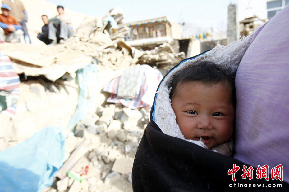 圖為4月15日,玉樹,三個(gè)月大的白瑪才措被母親搶救出來(lái)。青友 攝