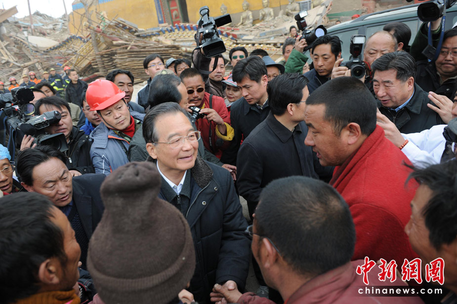 4月16日上午,中國(guó)國(guó)務(wù)院總理溫家寶來到距離玉樹縣城約10公里的禪古寺,看望受災(zāi)僧侶和民眾。溫家寶表示,只要有一線希望,就將盡最大努力救援,他還慰問了正在現(xiàn)場(chǎng)實(shí)施挖掘救援的工作人員。中新社發(fā) 符永康 攝