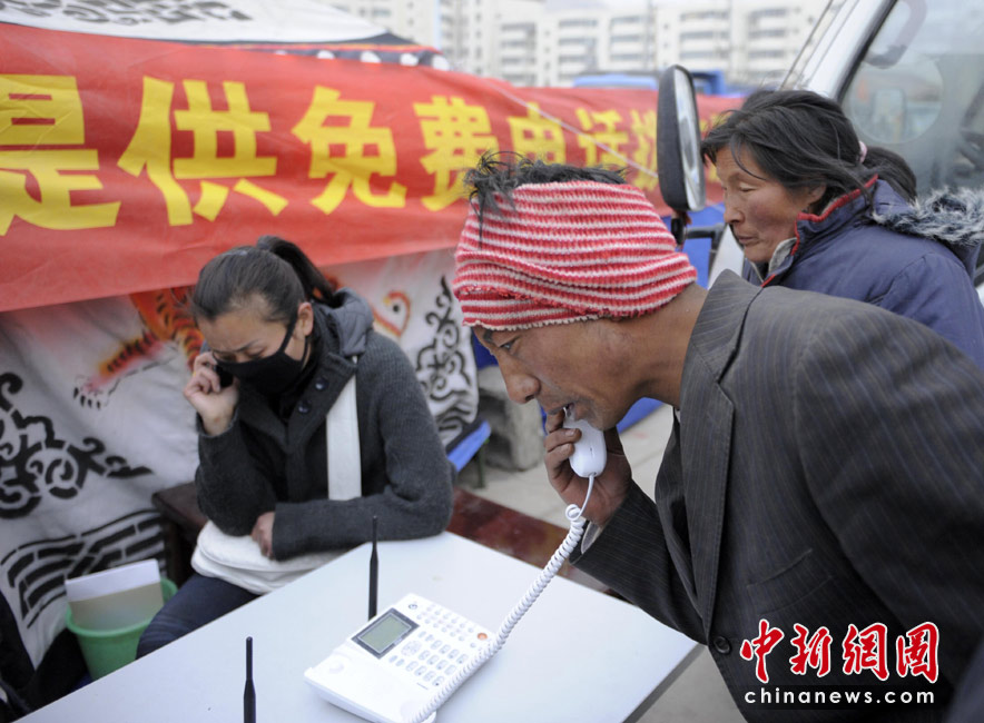 4月16日,青海玉樹體育場(chǎng)地震受災(zāi)民眾安置點(diǎn),民眾撥打有關(guān)部門安裝的免費(fèi)電話報(bào)平安。 中新社發(fā) 廖攀 攝