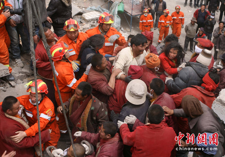 2010年4月16日13:50分左右,青海省玉樹(shù)藏族自治州玉樹(shù)縣地震發(fā)生第三天,在中心城區(qū)一垮塌賓館現(xiàn)場(chǎng)一名被埋54小時(shí)13歲的才珍拉姆被國(guó)家地震局應(yīng)急救援隊(duì)等成功救出。4月14日07時(shí)49分許,青海省玉樹(shù)藏族自治州玉樹(shù)縣(北緯33.1,東經(jīng)96.7)發(fā)生7.1級(jí)地震。中新社發(fā) 劉忠俊 攝