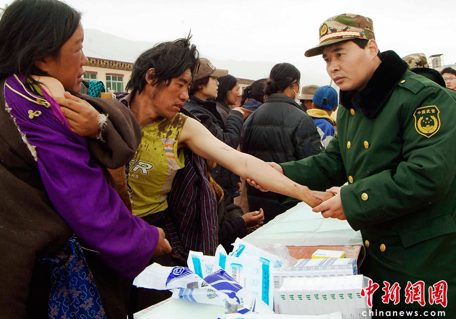 4月16日上午,廣東邊防總隊(duì)抗震救災(zāi)醫(yī)療隊(duì)在青海玉樹州結(jié)古鎮(zhèn)民族師范學(xué)院廣場(chǎng)設(shè)立救治點(diǎn),當(dāng)日救助地震災(zāi)區(qū)傷員200多名。中新社發(fā) 陳森陽(yáng) 攝