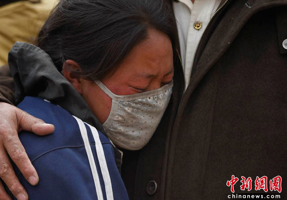2010年4月16日,青海玉樹藏族自治州玉樹縣結(jié)古鎮(zhèn)一所中學(xué)的震災(zāi)救援現(xiàn)場,痛失孩子的母親淚流不止。中新社發(fā) 盛佳鵬 攝