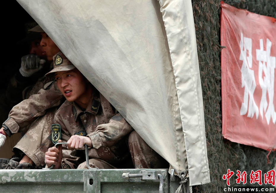 2010年4月16日,青海玉樹藏族自治州玉樹縣結(jié)古鎮(zhèn),剛剛抵達(dá)的三名解放軍準(zhǔn)備投入現(xiàn)場救援。中新社發(fā) 盛佳鵬 攝