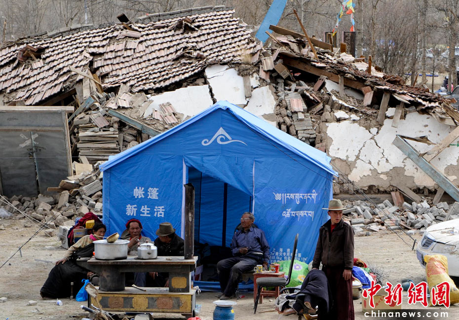 4月16日,青海玉樹衛(wèi)生職業(yè)中專的受災(zāi)民眾在地震廢墟前的帳篷里生活,基本生活條件得到保障。目前38000余棉帳篷正在運往災(zāi)區(qū),有超過1萬頂帳篷已經(jīng)運抵。中新社發(fā) 廖攀 攝