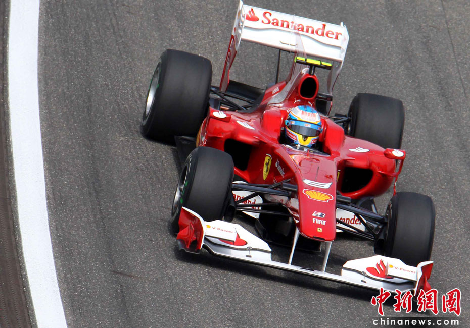4月17日下午,2010國際汽聯(lián)F1世界錦標(biāo)賽上海站在上海國際賽車場(chǎng)舉行排位賽,代表紅牛車隊(duì)出戰(zhàn)的德國車手維特爾獲得桿位,隊(duì)友、澳大利亞車手韋伯獲得第二名,法拉利車隊(duì)的西班牙車手阿隆索獲得第三名。中新社記者 任晨鳴 攝