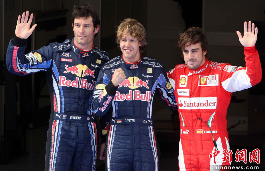 4月17日下午,2010國際汽聯(lián)F1世界錦標(biāo)賽上海站在上海國際賽車場舉行排位賽,代表紅牛車隊出戰(zhàn)的德國車手維特爾(中)獲得桿位,隊友、澳大利亞車手韋伯(左)獲得第二名,法拉利車隊的西班牙車手阿隆索獲得第三名。中新社記者 任晨鳴 攝