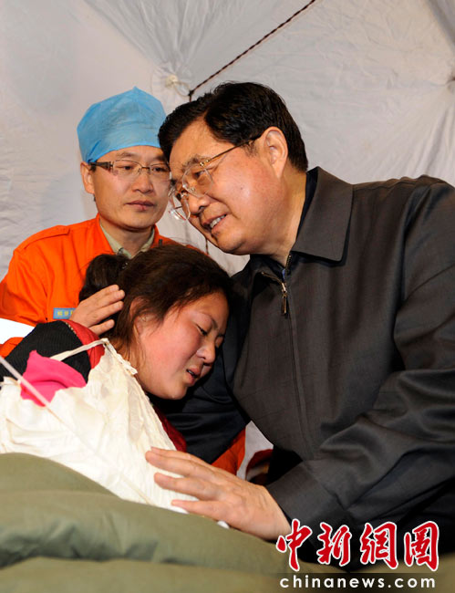4月18日,中共中央總書記、國(guó)家主席、中央軍委主席胡錦濤來到青海玉樹體育場(chǎng)地震災(zāi)民安置點(diǎn)看望受災(zāi)民眾和醫(yī)務(wù)人員。中新社發(fā) 廖攀 攝