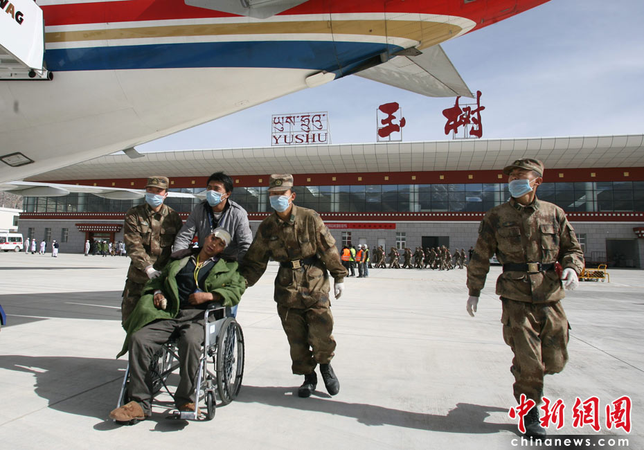 4月18日,青海省軍區(qū)救援隊(duì)在玉樹(shù)機(jī)場(chǎng)運(yùn)送傷員。中新社發(fā) 蘇丹 攝