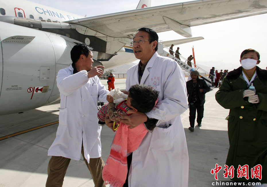 4月18日,青海省第五人民醫(yī)院院長(zhǎng)吳天俊等在玉樹機(jī)場(chǎng)搶運(yùn)受傷嬰兒。中新社發(fā) 蘇丹 攝