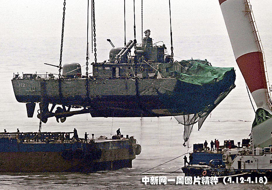 近三周前爆炸沉沒的韓國天安號軍艦周四被打撈出水,工作人員在沉船殘骸內發(fā)現(xiàn)36名韓國海軍官兵的遺體。天安號排水量1,200噸,三周前在朝韓邊界海域發(fā)生不明原因的爆炸而沉沒。