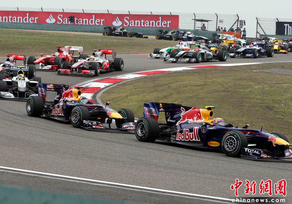 4月18日下午,2010國際汽聯(lián)F1世界錦標賽上海站在上海國際賽車場舉行正式比賽,邁凱輪車隊的英國車手巴頓在雨中獲得冠軍、隊友、英國車手漢密爾頓獲得亞軍,梅賽德斯GP車隊的德國車手羅斯伯格獲得季軍。圖為比賽發(fā)車后眾位車手通過一號彎。中新社記者 任晨鳴 攝